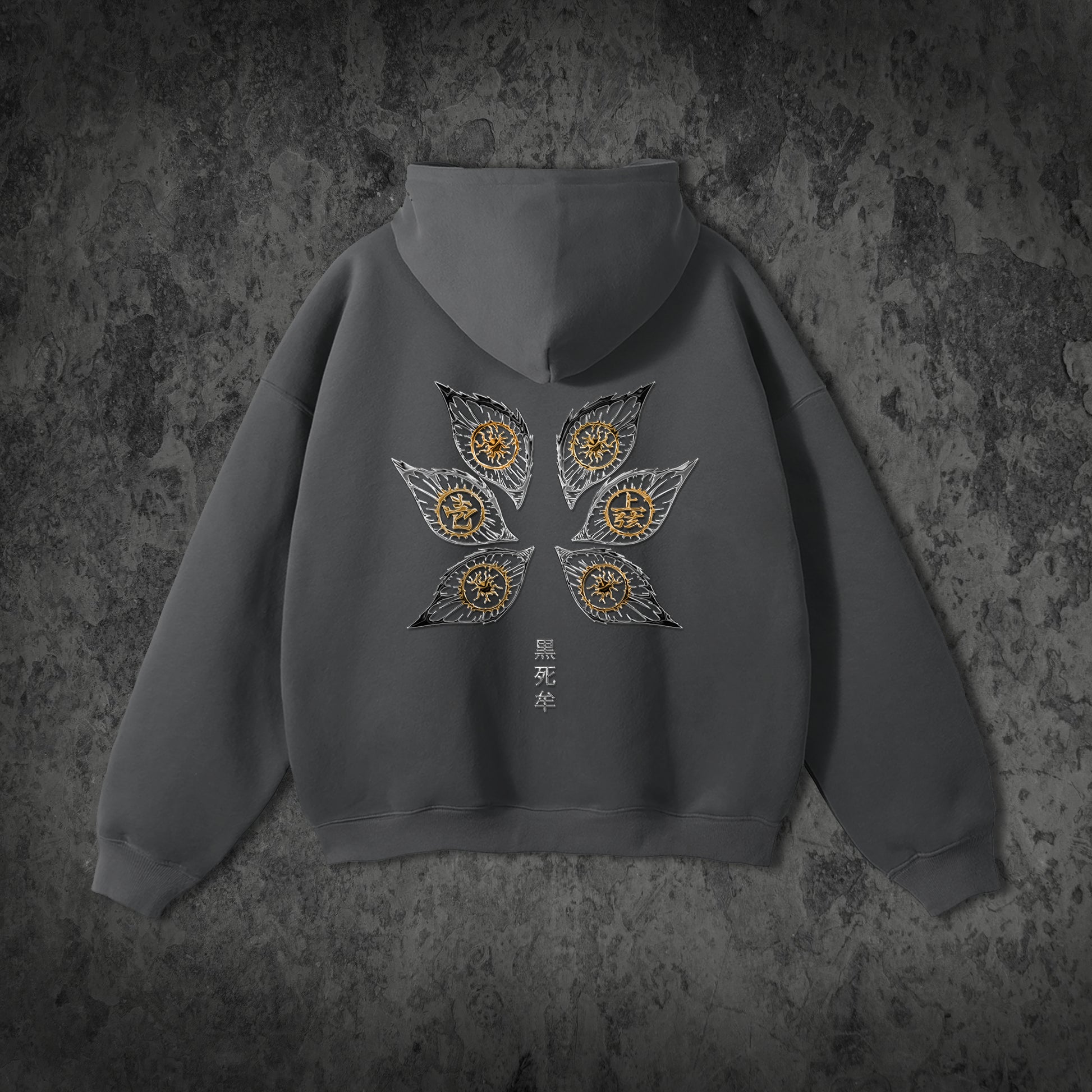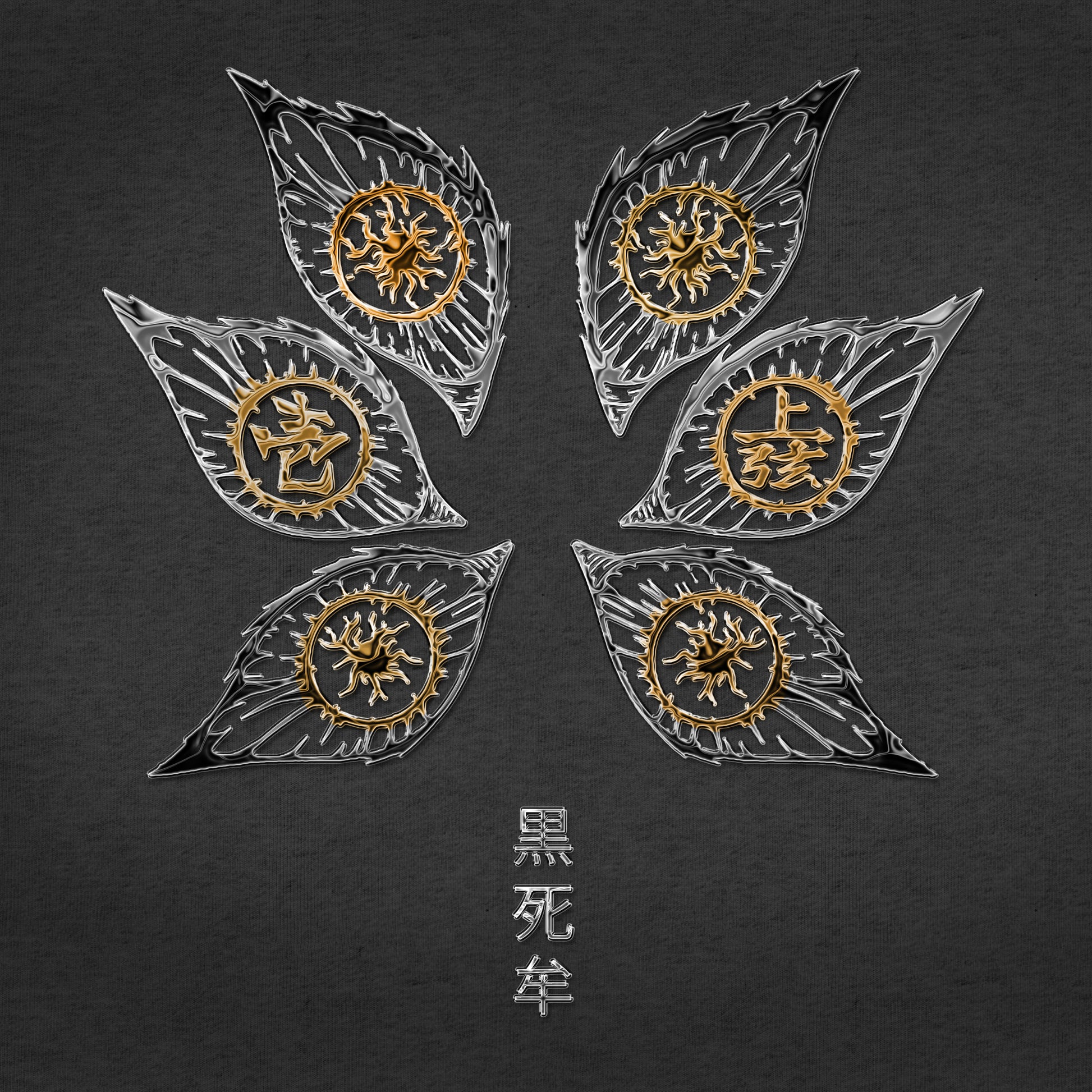 Blending metallic textures with sharp detailing. Each eye is framed by chrome-flame  jagged, flame-shaped outlines in chrome tones, symbolizing both chaos and control. The intricate golden iris designs mirror Kokushibo’s supernatural vision, while the kanji 黒死牟 ("Kokushibo") grounds the piece in raw, mythic energy.
