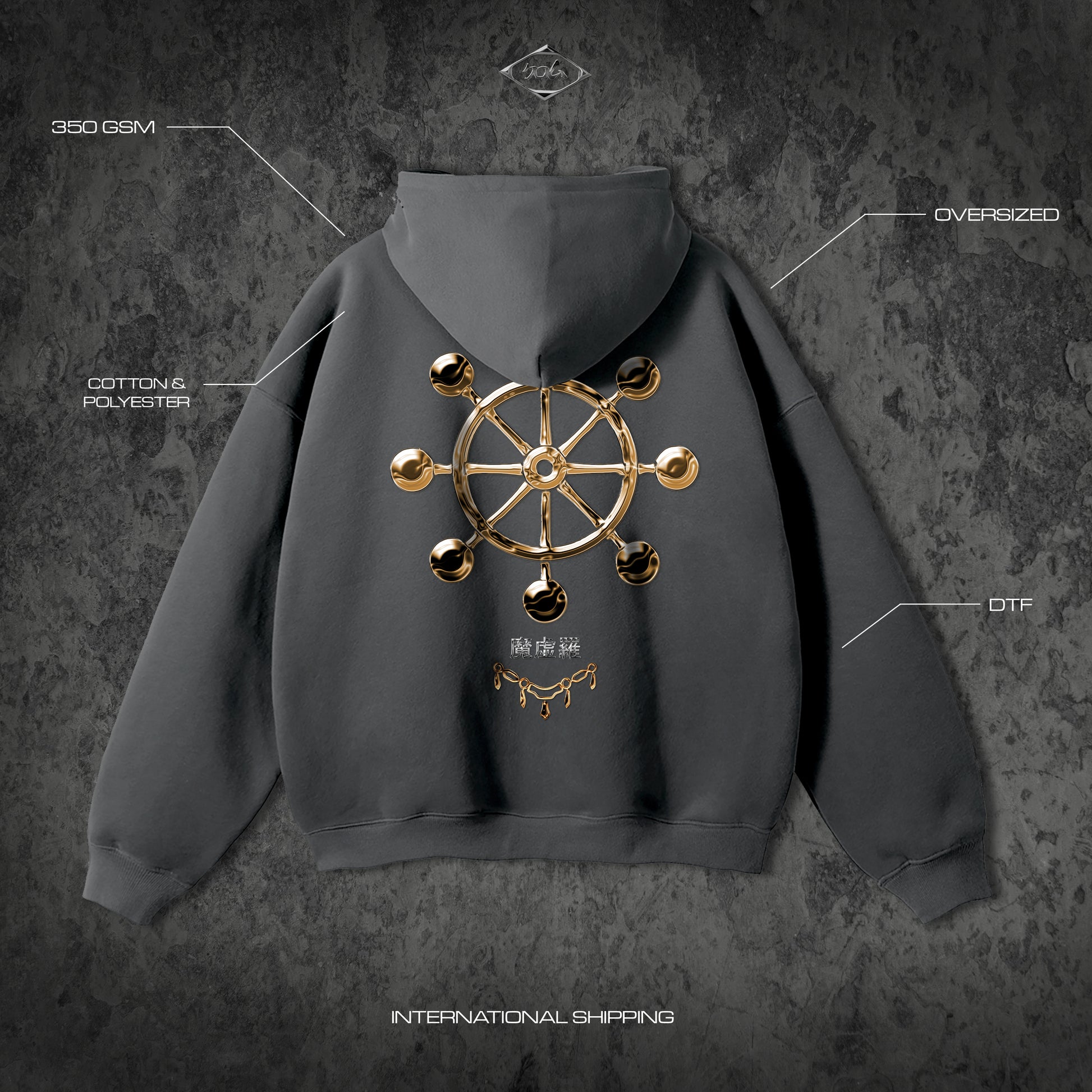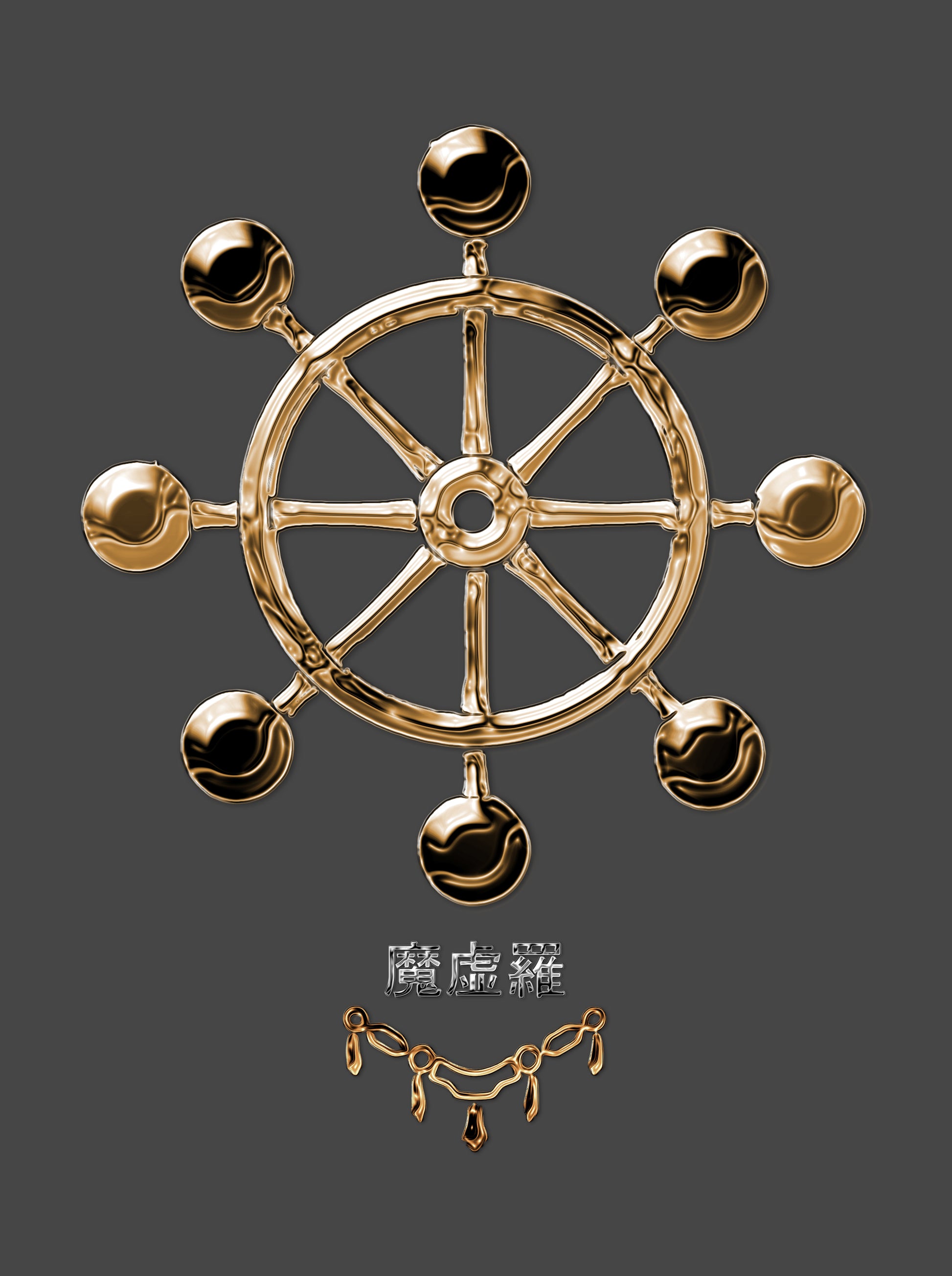 Gold chrome Dharma Chakra Wheel inspired by Mahoraga.